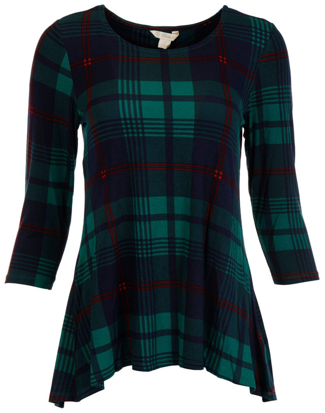 Celebrate the season in comfort with the Womens 3/4 Sleeve Green Plaid Leggings Tee. Featuring a festive plaid print, round neckline, and stretchy fabric, this top is perfect for holiday gatherings or cozy days at home. Fabrication is 95% rayon, 5% spandex