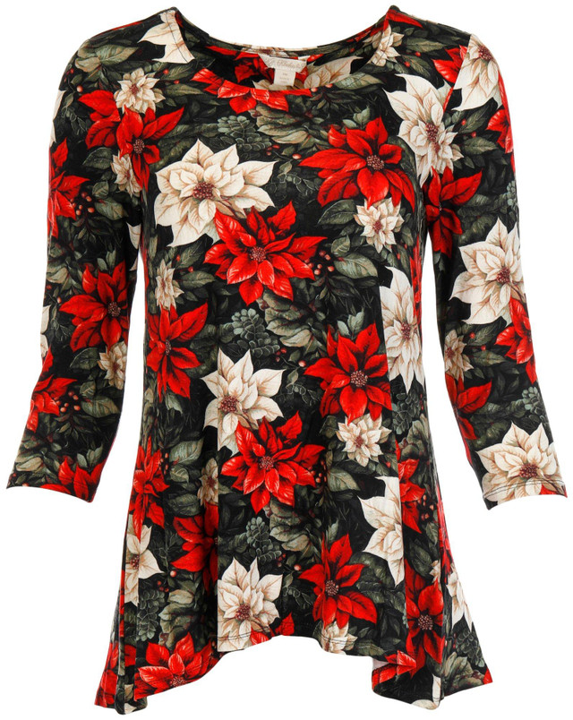 Celebrate the season in comfort with the Womens 3/4 Sleeve Poinsettia Leggings Tee. Featuring a festive poinsettia print, round neckline, and stretchy fabric, this top is perfect for holiday gatherings or cozy days at home. Fabrication is 95% rayon, 5% spandex