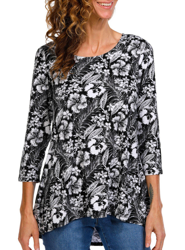 This women's top features 3/4 sleeves, a round neckline, and a bold print. Perfect for yoga or other athletic activities, it combines comfort and style for a confident look in motion or at rest. Fabrication 95% rayon, 5% spandex.