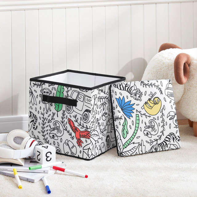 Take your childs creativity and love of coloring to the next level with the fun interactive design of this Childrens Coloring Storage Cube. This hamper is constructed of a strong durable fabric adorned with black and white prints just waiting to be explored. This multi-functional piece features a lid to keep contents concealed, durable reinforced handles and a convenient collapsible design for easy storage. Includes 4 washable markers. Measures 11 in. x 11 in. x 11 in.