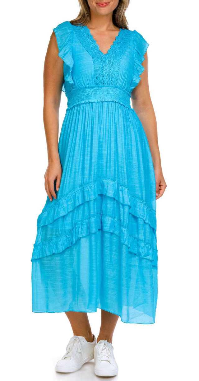 Chic and flirty, this Women's Short Sleeve Open Back Midi Dress is made from a soft polyester-rayon blend. It features a solid color, ruffle-tiered skirt, smocked waistband, and a stylish open back with tie detail. The V-neckline and short ruffle sleeves add a feminine finishperfect for warm-weather occasions.