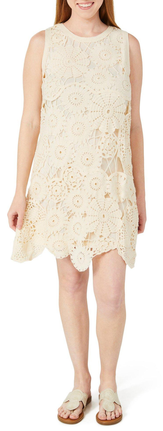 This women's sleeveless swing dress features a solid crochet exterior with a scalloped hem and a back keyhole neckline. With a flattering 36 inch length, it offers a breezy silhouette perfect for warm days and casual elegance. Fabrication 52% cotton, 48% polyester