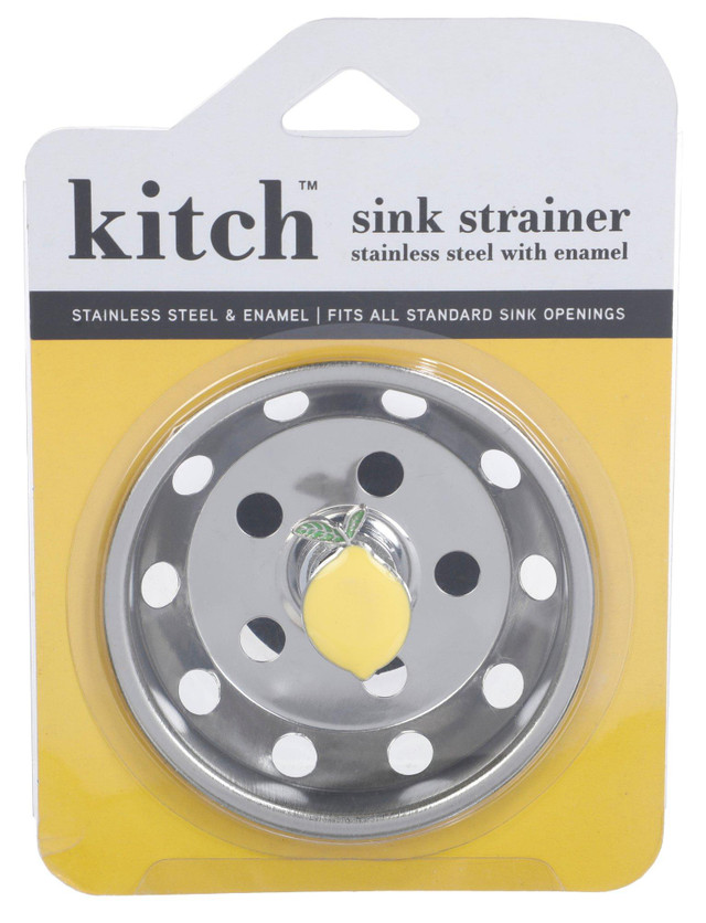 This stainless steel sink strainer features an enamel lemon decoration that adds a bright, cheerful accent to the sink. Designed to trap food and other debris, this strainer helps keep drains clear while offering a durable and easy to clean solution with a touch of fruit charm. Fits all standard sink openings.