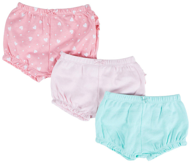Add a sweet touch to your little ones wardrobe with this 3-pack of Baby girl shorts. Featuring soft pastel colors and playful patternspink with little hearts, light pink, and light bluethese comfy, cotton-like bloomers have elastic waistbands and leg openings for a snug, gentle fit. Perfect for layering or wearing on their own!