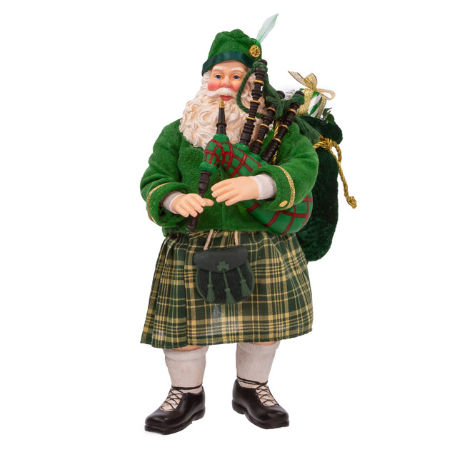 Part of Kurt Adler's Fabriche collection, the 10.5-Inch Fabriché Musical Irish Bagpiper Santa is a festive and unique holiday decoration featuring a Santa Claus figure dressed as an Irish bagpiper. The Santa figure is made of a fabric material, giving it a soft and detailed appearance. He is dressed in a traditional Irish kilt, complete with a red and green bagpipe.