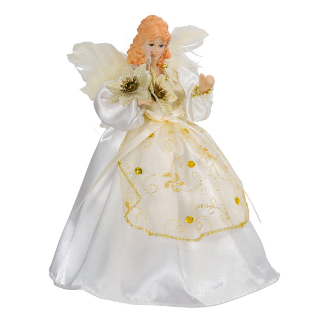 This Kurt Adler 10-Light 9 Ivory and Gold Angel Treetop is a beautiful, classic way to accent your Christmas tree. Dressed in a long, ivory dress adorned with gold trimming and detailing, this angel has white feathery wings, long hair, and lights up. This tree topper is for indoor-use only.