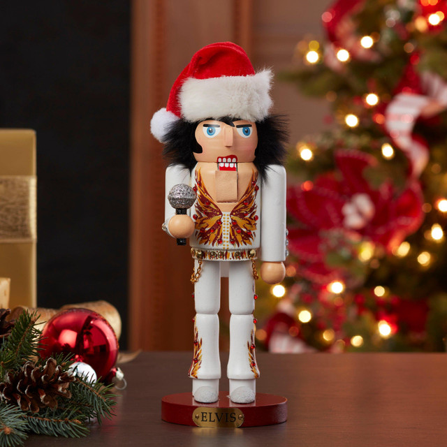 This Elvis® Presley nutcracker by Kurt Adler is perfect for any Elvis fan or nutcracker collector! The King is featured here wearing a colorful flame suit with red gems, and a classic Santa hat. He is holding a wireless silver microphone.