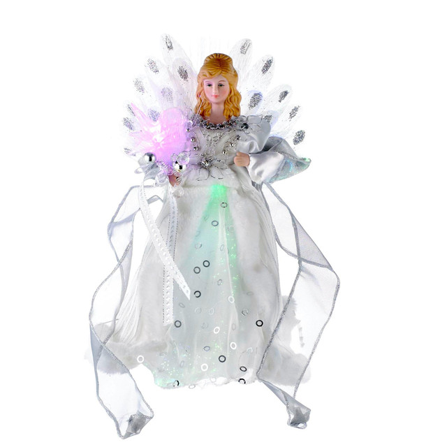 Top off your Christmas tree this year with this lovely Kurt Adler 12 White and Silver LED Fiber Optic Angel. Adorned with fiber optic wings in a white and silver dress with sequins, this angel will brighten not only your tree but the room overall. In addition to the 6 LED lights in her body, she also holds fiber optic strands in her hand with an LED light.