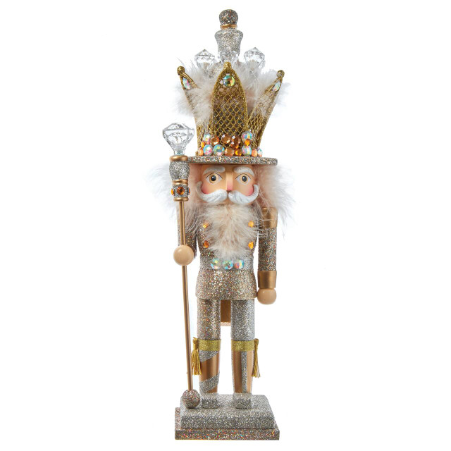 Hollywood Nutcrackers is a whimsical collection of nutcrackers created exclusively for Kurt S. Adler, Inc. and features an assortment of designs that put a unique, vibrant, memorable twist on traditional nutcrackers. This 16-inch King Nutcracker features a platinum and gold glittered color scheme, decorated with clear gemstones and is standing on a matching glittered base.