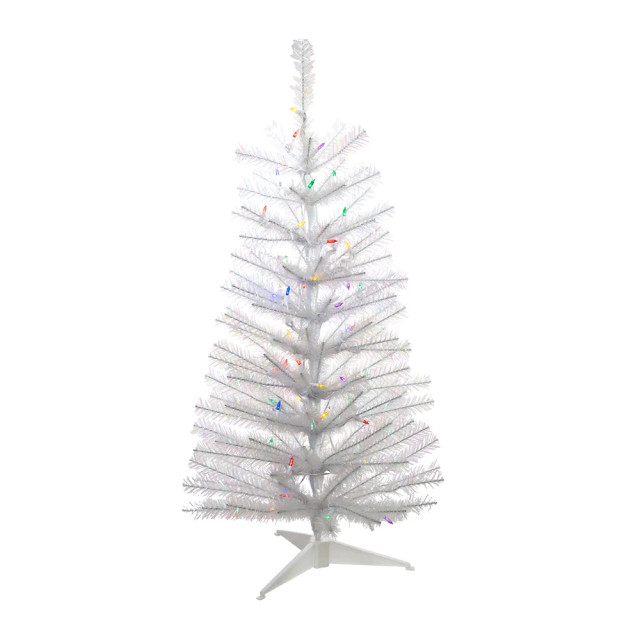 Add festive cheer to small spaces with this 3-Foot Pre-Lit Multicolored LED Glisten Pine Tree by Kurt Adler. Featuring 50 vibrant LED lights and a sturdy plastic base, this compact tree is perfect for apartments, offices, or tabletops. With a 20-inch diameter, it brings classic Christmas charm without taking up much room. Measures approximately 20 in. x 20 in. x 36 in.