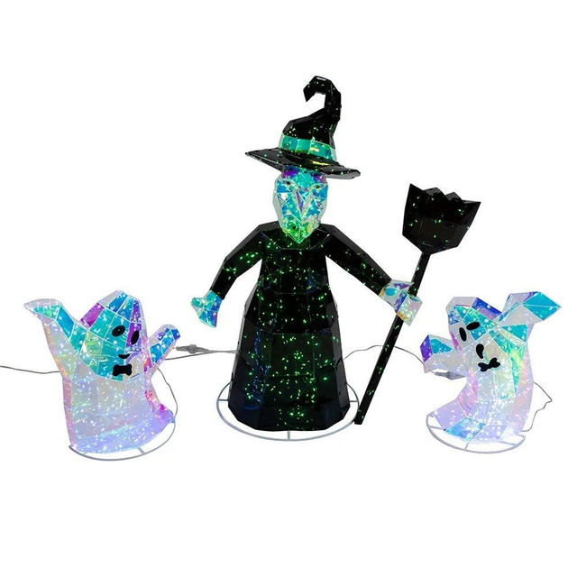 Light up Halloween with Kurt Adlers Pre-lit Holographic Witch and Ghosts Set. Featuring 300 green and 200 cool white LED lights, this shimmering trio adds magical glow indoors or outdoors. With holographic charm and durable design, it is perfect for parties, yards, or spooky displays. Measures 18 in. x 12 in. x 28 in.
