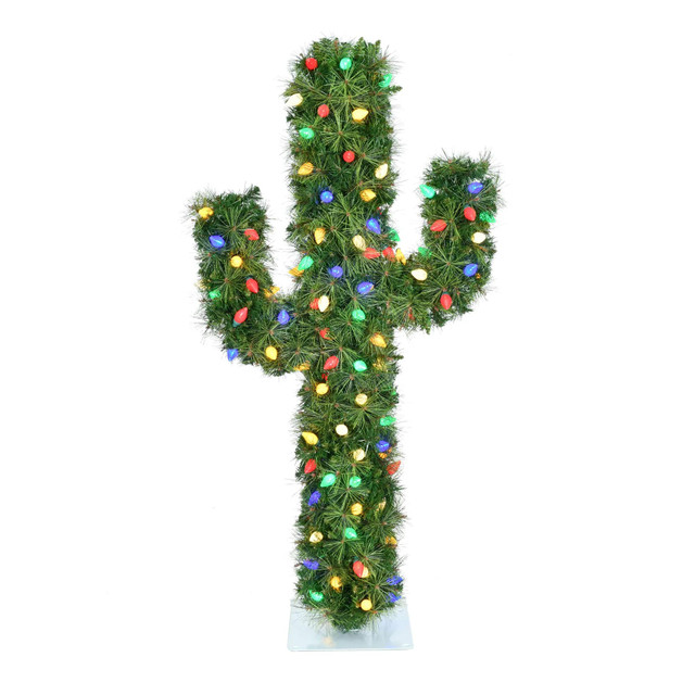 This cactus-shaped decoration is a playful twist on traditional holiday lighting and is designed to bring a fun and colorful ambiance to your space. Standing at 4 feet tall, this cactus is a noticeable and eye-catching piece that can serve as a focal point in your decor. Pre-lit with 100 multicolored C7 LED lights, it offers a bright and vibrant display in your home. Measures 8 in. x 21 in. x 48 in.