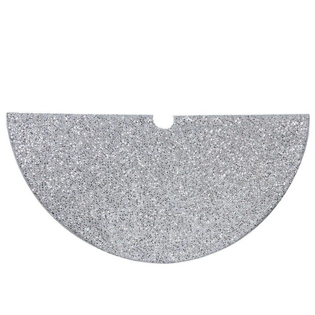 Add sparkle to your holiday décor with the Kurt Adler 48 in. Silver Sequined Tree Skirt. Featuring shimmering sequins and a metallic cord trim, this elegant skirt reflects light beautifully for a glamorous touch. Its 48 size fits most trees, offering full coverage and floor protection. Measures 48 in. x 48 in. x 0.25 in.