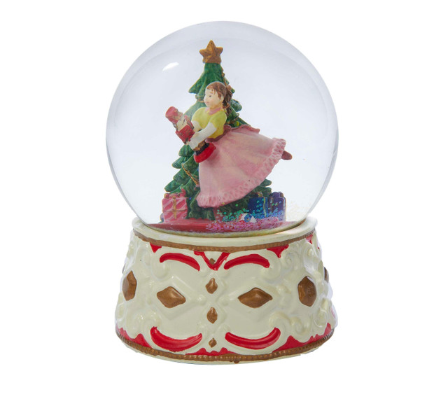 This Kurt Adler Clara with Nutcracker Musical water globe is a fun and classic way to add to your holiday décor! In the globe, Clara can be seen excitedly dancing with a toy-sized nutcracker around a star-topped Christmas tree. The globe sits atop an ornate red, white, and gold ceramic base. Wind up the piece to hear the tune, March of the Toy Soldiers. Measures 4 in. x 4 in. x 5.5 in.