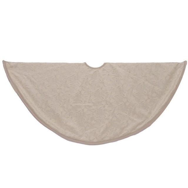 Add elegance to your holiday décor with Kurt Adlers 54 in. Cream and Platinum Poinsettia Tree Skirt. Featuring shimmering platinum poinsettias on a soft cream background, this oversized skirt fits larger trees and adds a luxurious touch. Perfect for protecting floors and enhancing your festive display. Measures 54 in. x 54 in. x 0.25 in.