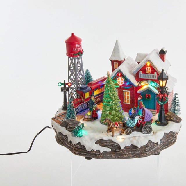 This Christmas Village features a glittered Christmas tree, lamp post, train, water tower, a horse drawn carriage and a welcome building. When switched on this piece lights up for a festive glow. It plays the classic tunes Jingle Bells, We Wish You a Merry Christmas, Silent Night, Deck the Halls, Joy to the World, The First Noel, Hark! The Heard Angel Sing and Oh, Christmas Tree. Includes a UL DC 4.5 adapter. Measures 9.5 in. x 6 in. x 9.25 in.