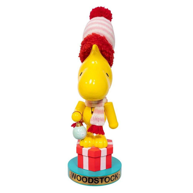 Celebrate the holidays with Kurt Adler's 10 in. Woodstock Nutcracker. Featuring the beloved Peanuts character in a festive hat and scarf, holding a glittery ornament atop a striped gift box, this whimsical piece adds cheerful charm to Christmas décor. Perfect for Peanuts fans and holiday collectors. Measures 5 in. x 6.8 in. x 10 in.