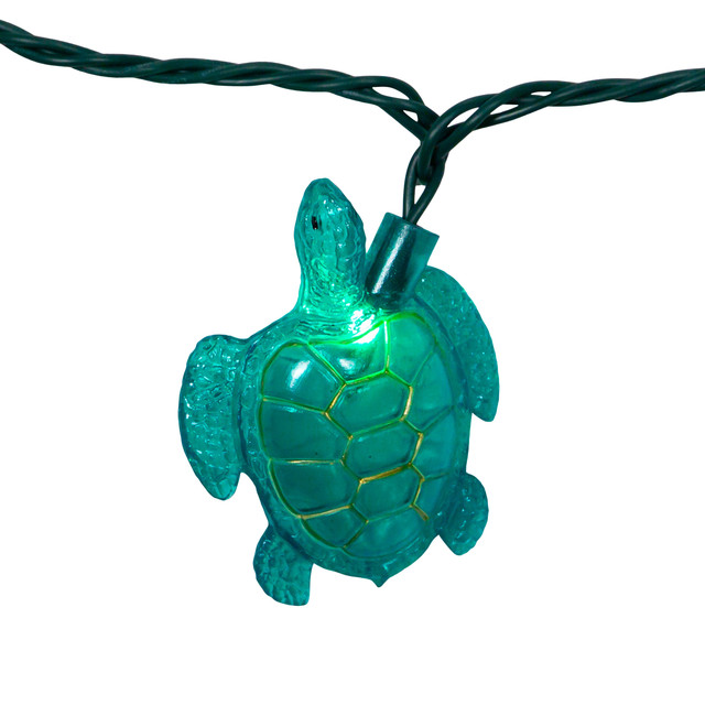 This UL 10-Light Sea Turtle Light Set is a fun, unique way to add to the lighting of any theme party décor! Each of the 10 lights in this novelty light set resembles a green turtle with gold accents on its back. Each of the 10 clear incandescent lights have a turtle light cover and can be used both indoors and outdoors. Measures 144 in. x 2.8 in. x 3 in.
