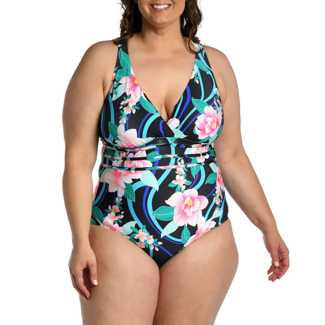 This textured one piece features clean and crisp textured lines that add a touch of sophistication to your beachside look. Beautifully balanced, the mesh insert beneath the sexy v-plunge neckline define your waist and a built-in tummy control panel smooths and slims. The fixed multi-strap cross-back design keeps everything neatly tucked in. Fabrication is 87% Polyester, 5% Nylon, 8% Elastane.