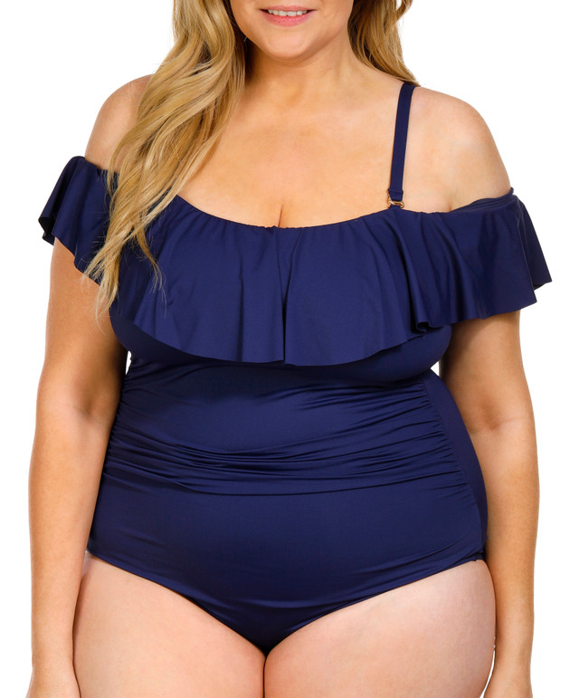 The Plus Solid Off The Shoulder One Piece Swimsuit with Ruffle combines elegance and playful flair. Featuring a flattering off-the-shoulder design and a feminine ruffled neckline, this swimsuit offers both comfort and style. Perfect for showcasing your curves, it provides full coverage while giving you a chic, trendy look by the pool or at the beach.