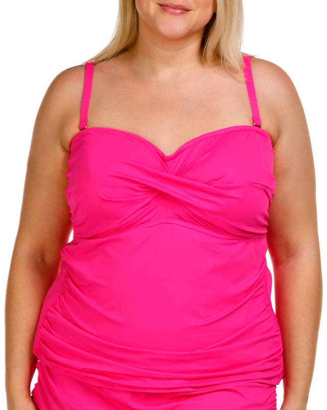Introducing the Plus Twist Band Tankini Top, crafted from a blend of nylon and elastane for a comfortable and flattering fit. This stylish tankini features a solid color design, adjustable straps for a customized fit, and a chic twist front detail. Perfect for beach days or poolside lounging, the Plus Twist Band Tankini Top combines elegance and functionality, making it a must-have addition to your swimwear collection.