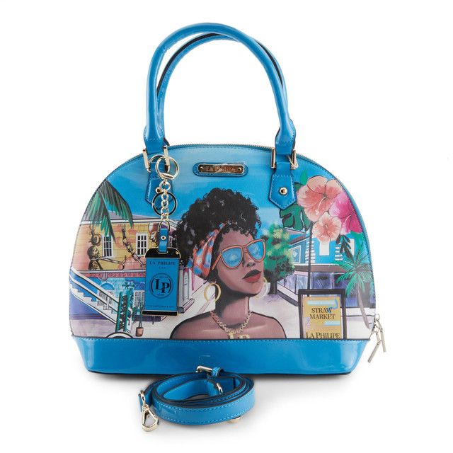 Elevate your style with the Blue In Bahamas Classic Bowler Handbag. Crafted from 100% premium PU leather, this striking blue bag features a stylish lady in a vibrant cityscape, capturing the spirit of adventure. Its unique oval shape adds a chic flair, making it the perfect accessory for any occasion. Embrace the essence of island life and express your vibrant personality! Measurements: handbag 14 in. x 6 in. x 11 in., drop 5.5 in., shoulder strap 20-23 in.