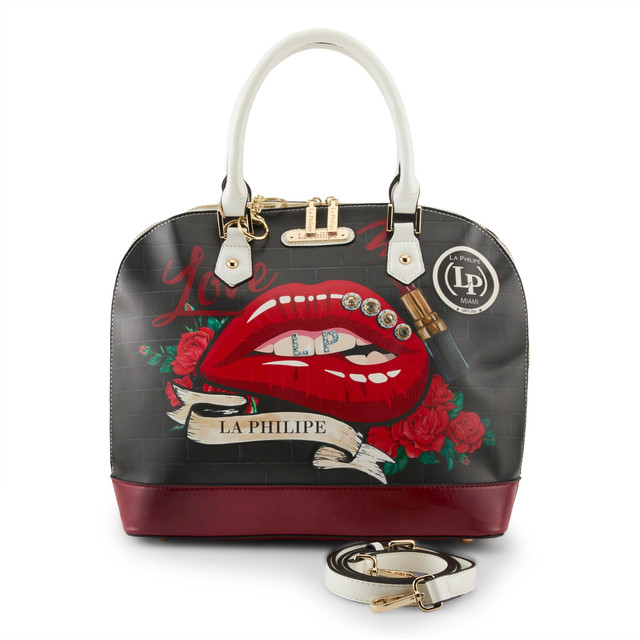 Make a bold statement with the Red Lips Large Bowler Handbag. Crafted from 100% premium PU leather it features a striking design of luscious red lips set against a sleek black background. Great for casual outings and glamorous evenings, this bag is more than just an accessory: it's a declaration of your personality and flair! Measurements: handbag 14 in. x 6 in. x 11 in., drop 5.5 in., shoulder strap 20-23 in.