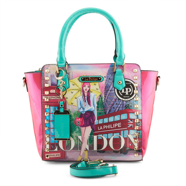 Embrace the charm of the English capital with the Umbrella in London Trapeze Tote Handbag. Crafted from 100% premium PU leather, it features a delightful design of an iconic umbrella against a backdrop of London's stunning skyline. With its unique tote shape and spacious interior, it adds a touch of British elegance to any outfit. Let the Umbrella in London Handbag be your stylish traveling companion! Measurements: handbag 14 in. x 6 in. x 11 in., drop 6 in., shoulder strap 20-23 in.