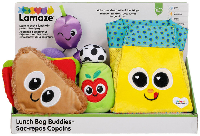 Everything needed to pack a fun lunch is included. Toddlers will practice fine motor skills as they make their own sandwich with all the fixings. Theres bread, a slice of cheese, a tomato slice, lettuce, and a happy bag to put them all in. Each piece features interesting textures and surprise crinkles that encourage baby to touch, stimulating tactile senses. The apple juice box opens with a crackling sound or shake the grapes to see what fun noises they make.