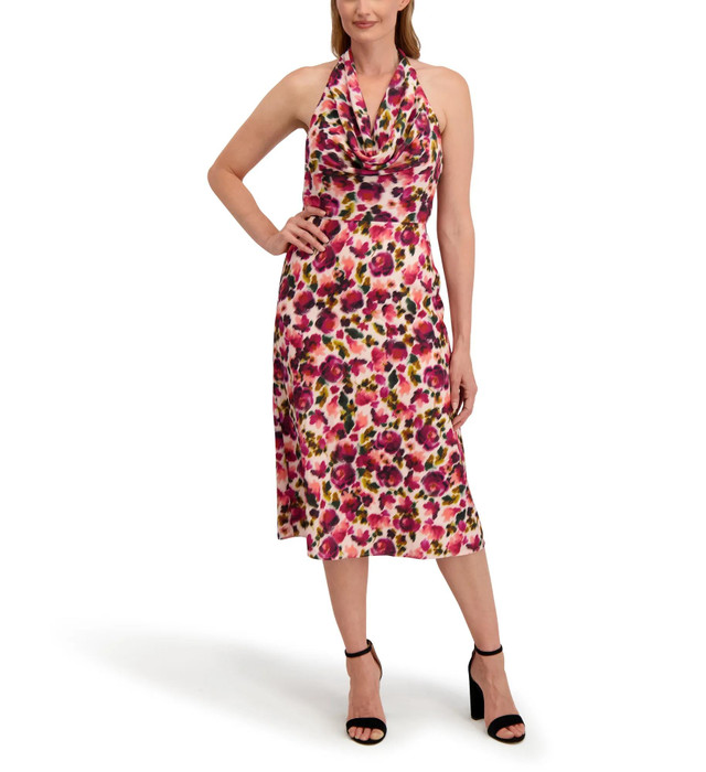 Graceful and refined, the Floral Satin Cowl Neck Dress by Laundry by Shelli Segal features a soft cowl halter neckline, stretch satin fabric, and a flattering floral design. With a halter closure and hidden zipper, this fully lined silhouette offers elegant style for special occasions and evening events.