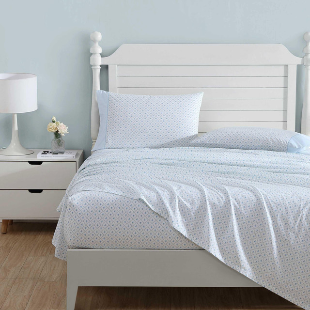 Elevate your home décor with the traditional and timeless sheets Laura Ashley Kate Cotton Percale Sheet Set. Crafted from premium T200 percale cotton, they provide a soft to the touch feel and enduring comfort. The unique complementary hem adds style and individuality to your bed, creating a truly distinctive look for your bedroom décor. The fully elasticized fitted sheet fits queen and king mattresses up to 18 in. deep (16 in. deep for twin size, 17 in. for full size).
