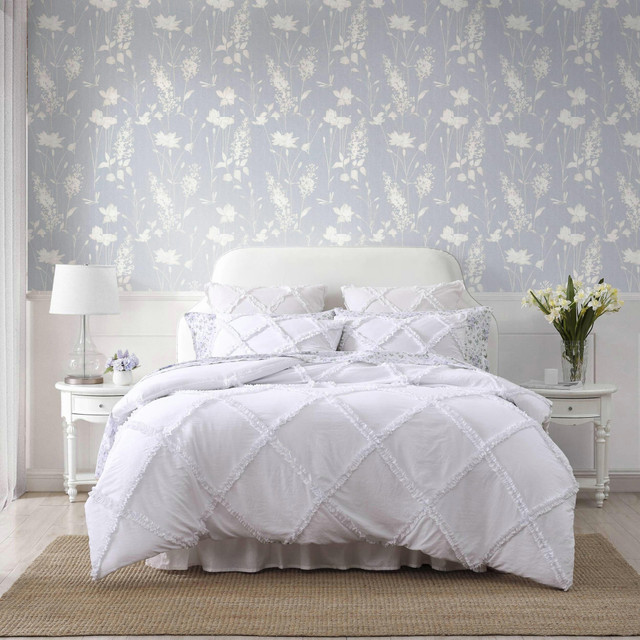 The Laura Ashley Norah Comforter & Sham Set exudes timeless elegance with romantic ruffles arranged in a diamond heirloom pattern. Crafted in soft, solid white microfiber, it offers a serene and versatile foundation for any bedroom. Lightweight and machine washable, it blends classic charm with effortless care, perfect for refined, layered styling.