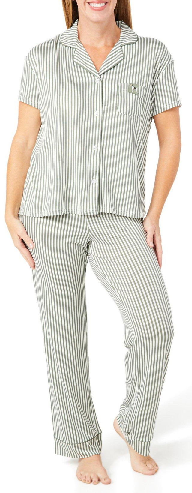 Relax in timeless style with the Women's 2 Pc Striped Pajama Pants Set. Featuring a striped short sleeve, button-down top with a notch collar and matching striped pants, this cozy set blends classic design with everyday comfort. Fabrication 90% polyester, 10% spandex