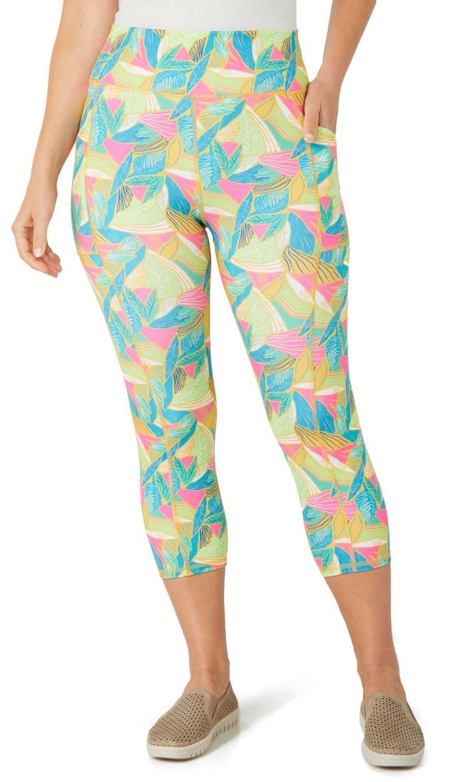 Move with confidence in these Active Cropped Capris, featuring a bold abstract print that energizes your every step. Designed for comfort and versatility, they offer a flattering fit with side slip pockets for on the go ease. Whether you're powering through a workout or running errands, these capris keep up in style. Inseam measures approximately 21.5 in. Fabrication is 39% recycled polyester, 39% polyester, 22% spandex.
