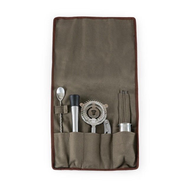 The 10-piece Bar Tool Roll Up Kit is a must-have for the traveling mixologist. Crafted from durable waxed canvas, this portable set includes essential bar tools like a jigger, muddler, strainer, corkscrew, and more. Perfect for camping, glamping, picnics, or home use, it rolls up neatly for easy transport. Mix cocktails anywhere with style and convenience.