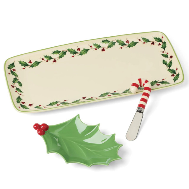 Bring classic Christmas charm to the table with this Holiday hostess set. A beloved favorite since 1974, its iconic holly and berry motif adds timeless elegance to any holiday gathering. Effortlessly festive and beautifully crafted, it's the perfect way to spread holiday cheer throughout your home. Measures 12 in x 5.75 in x 0.75, Set includes (1) large tray, (1) small dish, and (1) spreader. in.