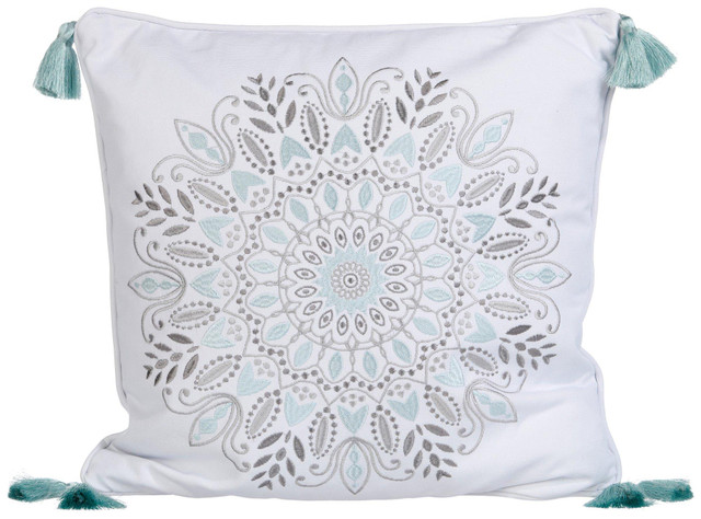 Elevate your space with this 18x18 decorative pillow featuring tassels on each corner for a touch of playful texture. The embroidered design showcases subtle hints of blue and green, bringing a soft splash of color and artisan charm. Perfect for layering or making a stylish statement in any room.