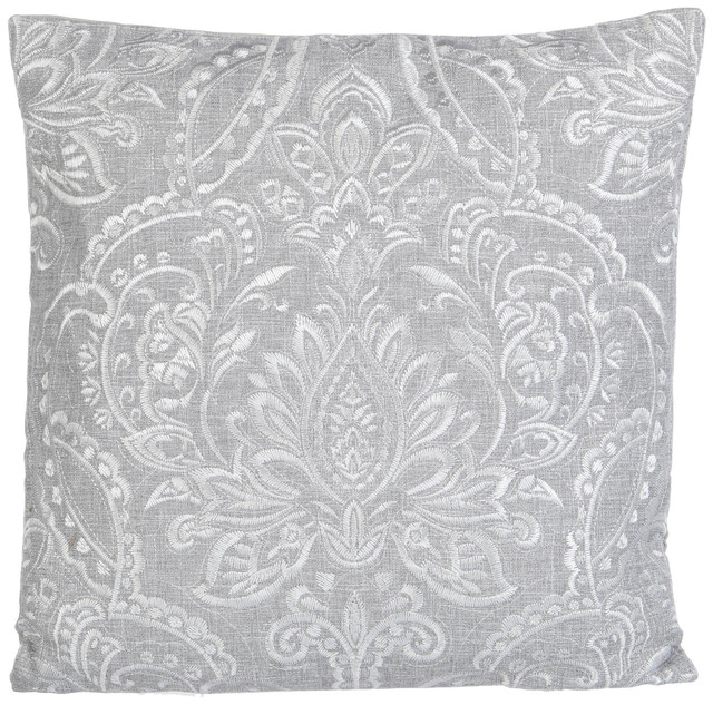 Add a sophisticated accent to your space with this 18x18 decorative square pillow by Levtex Home. Featuring an elegant embroidered design in soft grey tones with delicate hints of shimmer thread, it exudes a luxurious, upscale feel. The refined detailing and cozy texture make it a perfect statement piece for elevating bedrooms, living areas, or reading nooks with understated glamour.