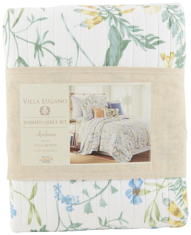Create a peaceful retreat with the 3-piece Apolonia Full/Queen Quilt Set, showcasing a delicate floral pattern inspired by nature. Including a quilt and two matching shams, this set blends soft comfort with timeless design. Crafted from quality materials, its ideal for refreshing bedrooms with a calming, serene touch. Measures approximately Quilt 88 in x 92 in, Standard Shams 26 in x 20 in. Fabrication is 100% cotton (cover), 90% cotton, 7% polyester, 3% nylon (fill).