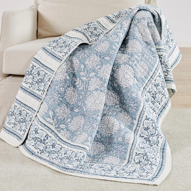 Wrap your home in elegance with the Adare Blue Reversible Throw by Levtex Home. A garden of blooming florals and graceful vines dances across a canvas of blue and white, framed in timeless beauty. Flip it to reveal a delicate striped vine design, echoing quiet charm. Crafted from soft cotton and filled with cozy comfort, it is a gentle touch of style and serenity, perfect for any space that longs for warmth and grace. Measures 50 in. x 60 in.
