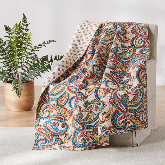 Add a vibrant boho touch to your space with the Alyssa Paisley Quilted Throw by Levtex Home. Bursting with swirling paisleys in orange, teal, red, green, yellow, and cream, this reversible throw brings playful energy and warmth. Crafted from ultra-soft, lightweight cotton with a cotton-rich fill, its perfect for cozying up in style, and it is machine washable for easy care. Measures 50 in. x 60 in.