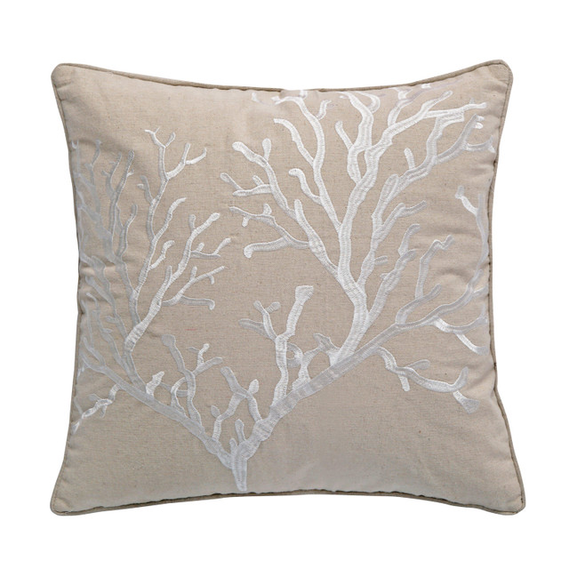 Bring laid-back coastal vibes to your space with the Levtex Home Bahamas Coral Taupe Pillow. Soft taupe cotton with white coral embroidery adds a breezy, beachy feel. It is comfy too, thanks to a plush duck feather insert, and the machine-washable shell makes it easy to care for. Perfect for your bed, sofa, or favorite chair. Measures 18 in. x 18 in. 3 in.