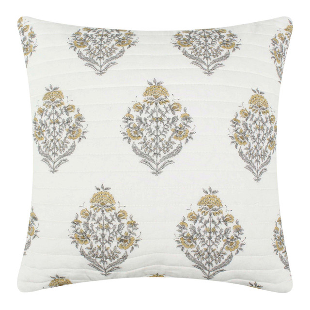 Grace your space with the refined beauty of the Floral decorative pillow. Featuring delicate miniature flower bushes in ochre and grey on a soft cream ground, it pairs effortlessly with the Levtex Home Kamira Ochre collection. The rich, earthy palette and luxurious feather fill make it a timeless accent for any bed, couch, or chair. Measures 18 in. x 18 in. x 3 in.
