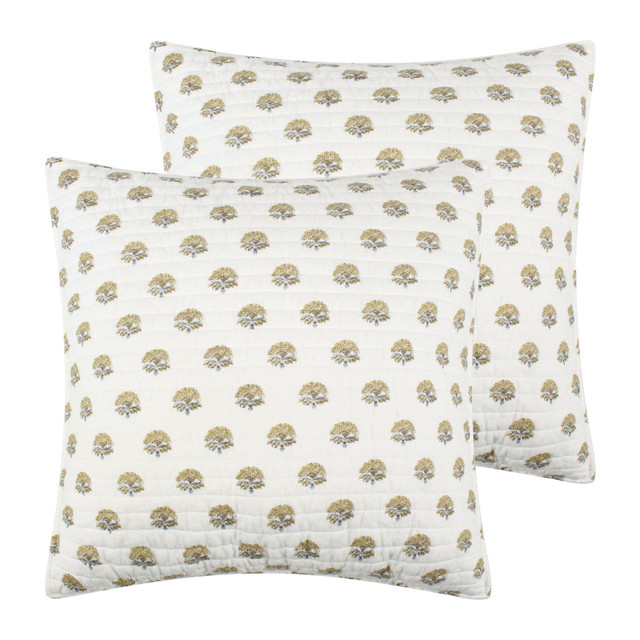 Add a touch of elegance with the Kamira Ochre Quilted Euro Sham by Levtex Home. Inspired by summer gardens, it features delicate ochre and grey floral bushes on a soft cream background. With a sophisticated paisley charm, this cotton sham is quilted for comfort and machine washable. Pillow insert not included. Each measures 26 in. x 26 in.