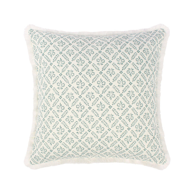 Elevate your space with the refined charm of the Basketweave decorative pillow. A textured woven floral design in soft green graces a cream ground, perfectly complementing the Levtex Home Melange collection. With its graceful palette and plush feather fill, it adds a sophisticated touch to any bed, couch, or chair. Measures 18 in. x 18 in. x 3 in.
