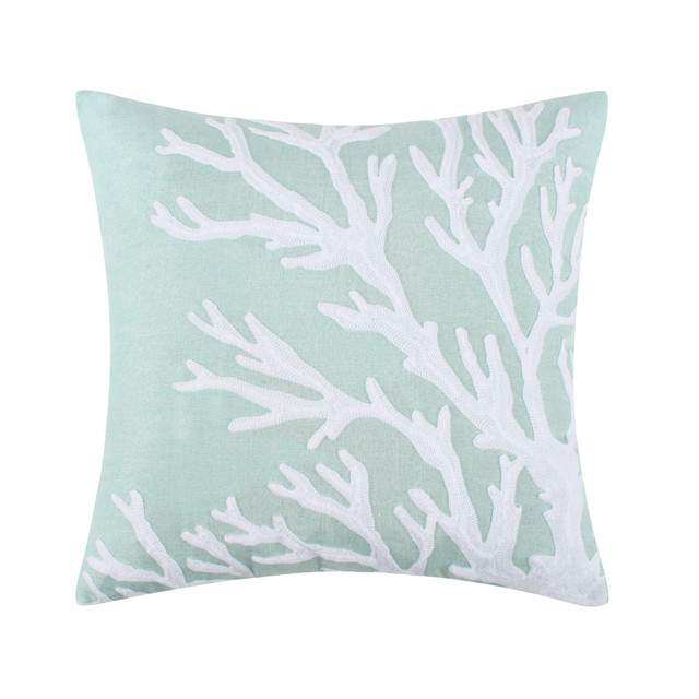 Bring a splash of seaside fun to your space with the Coral decorative pillow. A white crewel-stitched coral pops against a vibrant teal background, adding a cheerful coastal vibe. Pre-filled with a soft feather insert, its a comfy, eye-catching accent for your bed, couch, or favorite chair, perfect for beach lovers at heart! Measures 18 in. x 18 in. 3 in.
