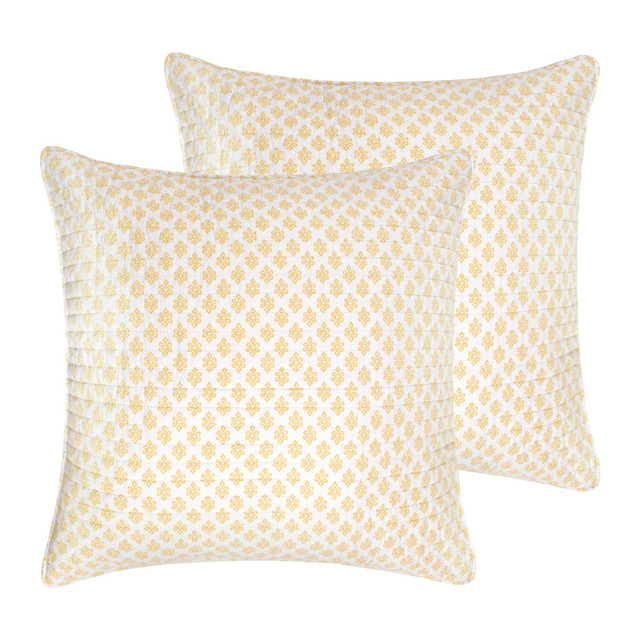 Brighten your space with the Radella Quilted Euro Shams by Levtex Home. Inspired by spring gardens, this set of 2 features delicate yellow-outlined flowers on a crisp white background. Made of soft cotton front and back with a cotton-rich fill, theyre quilted, cozy, and machine washable. Pillow insert not included. Each measures 26 in. x 26 in.