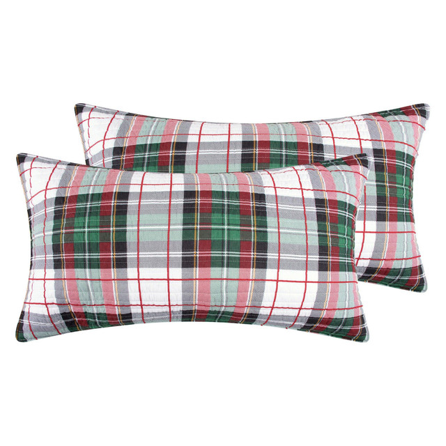 The Spencer Plaid Green Quilted King Sham (pack of 2) by Thatch Home for Levtex Home is inspired by traditional woven Scottish tartans. Offered in green, red and white, this design will immediately transform your bedroom. This sham features a green, red and white plaid in cotton on the front, reversing to a green, red and navy plaid in microfiber on the back. The King Sham (each 36 in.x 20 in.) is quilted with a cotton rich filler and is machine washable. Pillow inner not included.