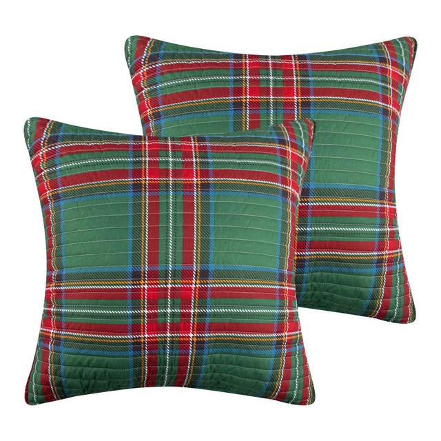 The Spencer Plaid Green Euro Shams Set of 2. Designed to finish the look of the Spencer Plaid Green bedding collection, these euro shams are also useful as an extra layer to lean back on while you read or watch television. Each euro sham is sized at (26 in.x 26 in.) and features a quilted red, and navy plaid on green ground. They come as a set of 2, and are unfilled. Extremely versatile, they can also be used alone to give any bed a little spot of sophistication, or a bit of holiday cheer.