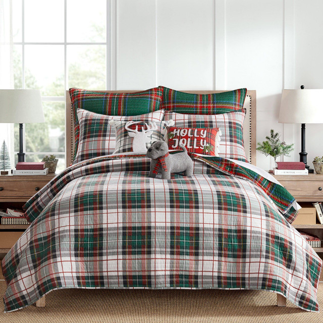 The Spencer Plaid Green ReversibleQuilt by Thatch Home for Levtex Home is inspired by traditional woven Scottish tartans. Offered in green, red and white, this design will immediately transform your bedroom. This reversible quilt features a green, red and white plaid in cotton on the front, reversing to a green, red and navy plaid in microfiber on the back. Filled with a cotton-rich filler. Machine washable. Enjoy for years to come!